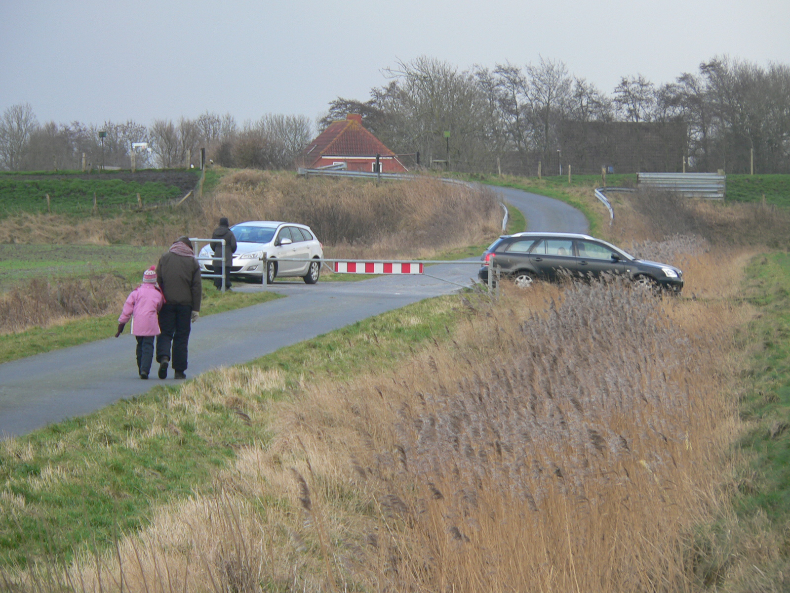 Wenn Sie dann nördlich an Hilgenriedersiel vorbeigefahren sind (Knotenpunkt 56 – das ist da, wo Sie auch links hoch über den Deich ins Vorland radeln könnten), nehmen Sie etwa 1,5 Kilometer weiter den ersten möglichen Rechtsabbieger (Knotenpunkt 52), fahren erst auf eine rotweiße Autoschranke, dann auf den Binnendeich zu und biegen sofort danach links auf den Trampelpfad ein, von dem in der Beschreibung für die Autofahrer schon die Rede war. Das dritte Haus ist dann der Deichblick.