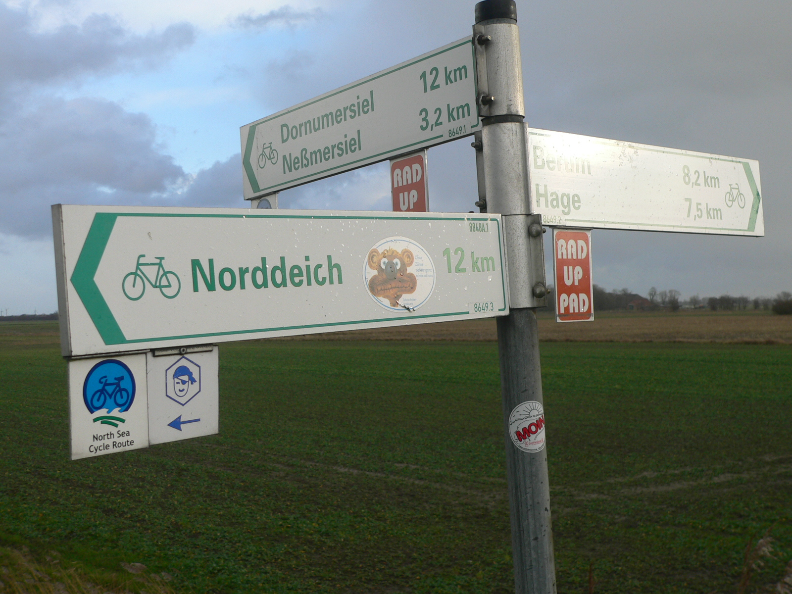 Wenn Sie dann nördlich an Hilgenriedersiel vorbeigefahren sind (Knotenpunkt 56 – das ist da, wo Sie auch links hoch über den Deich ins Vorland radeln könnten), nehmen Sie etwa 1,5 Kilometer weiter den ersten möglichen Rechtsabbieger (Knotenpunkt 52), fahren erst auf eine rotweiße Autoschranke, dann auf den Binnendeich zu und biegen sofort danach links auf den Trampelpfad ein, von dem in der Beschreibung für die Autofahrer schon die Rede war. Das dritte Haus ist dann der Deichblick.