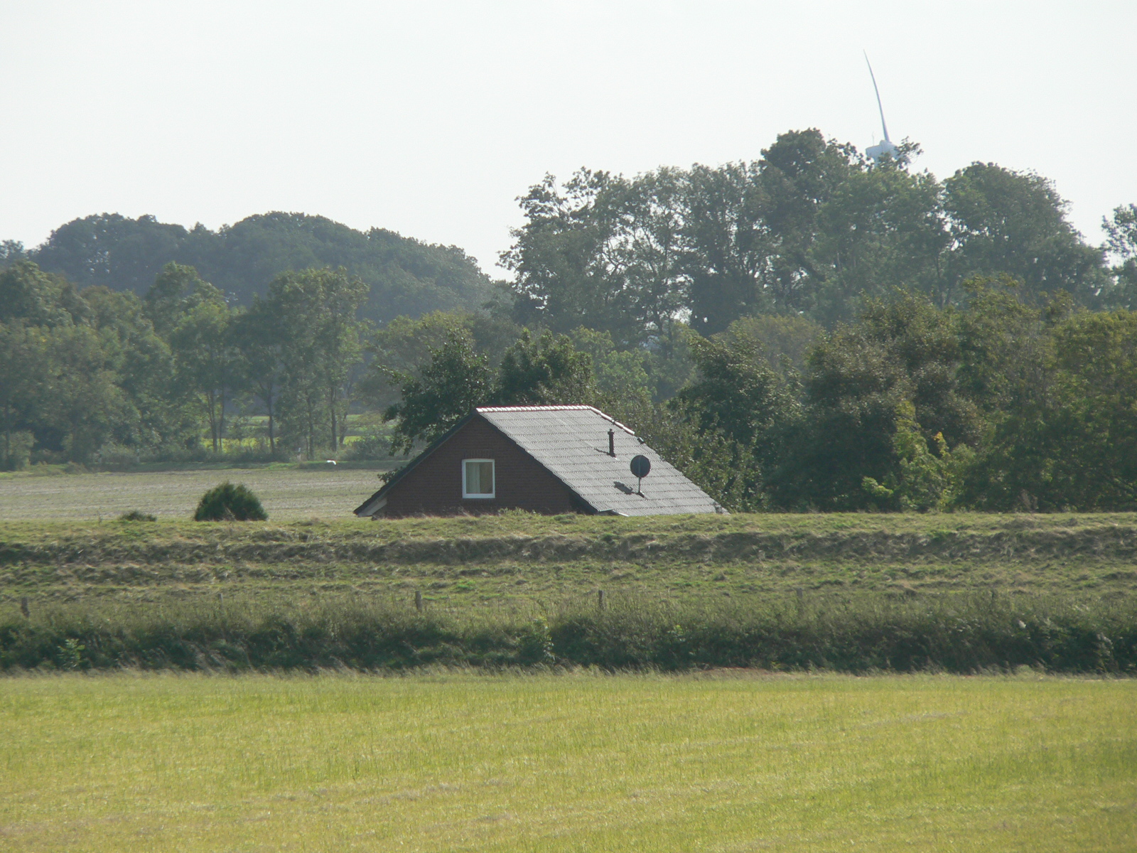 Das dürfte an der ostfriesischen Küste ziemlich einmalig sein: ein Ferienhaus in entschiedener Alleinlage, direkt hinter dem Binnendeich, auf dem gelegentlich ein paar Kühe vorbeischauen, an einem einspurigen Sträßchen, das ein paar hundert Meter weiter in einen Trampelpfad übergeht, also ohne Durchgangsverkehr und Autolärm, am Rande eines Landschaftsschutzgebietes, umgeben von Äckern und Grünland, nur von ferne ein paar Windräder und das eine oder andere rote Dach.