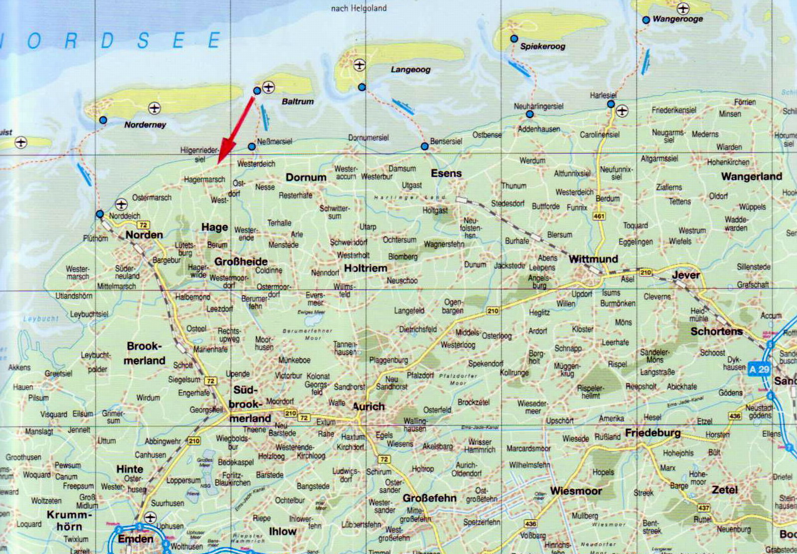 Des Rätsels Lösung: Irgendwann, bis er gekappt wurde, war Neßmersiels westlicher Osterdeicher Weg tatsächlich der östliche Anschluß nach Hilgenriedersiel. Und weil Neßmersiel zu Nesse und damit zur Gemeinde Dornum gehört, Hilgenriedersiel jedoch zur Hagermarsch und damit zu Hage, hat der Deichblick nur verkehrstechnisch mit Neßmersiel zu tun, aber administrativ rein gar nichts. Er ist vielmehr das nordöstlichste Haus der Samtgemeinde Hage.