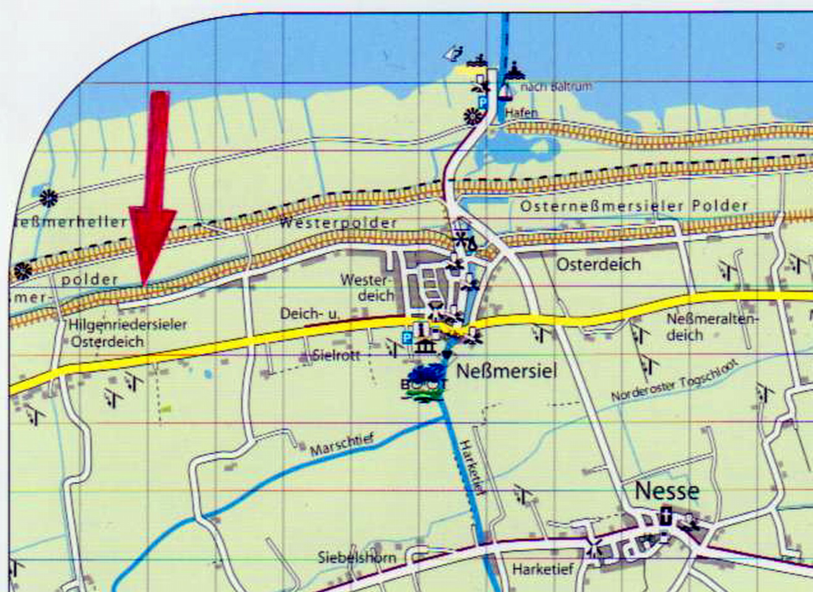 Des Rätsels Lösung: Irgendwann, bis er gekappt wurde, war Neßmersiels westlicher Osterdeicher Weg tatsächlich der östliche Anschluß nach Hilgenriedersiel. Und weil Neßmersiel zu Nesse und damit zur Gemeinde Dornum gehört, Hilgenriedersiel jedoch zur Hagermarsch und damit zu Hage, hat der Deichblick nur verkehrstechnisch mit Neßmersiel zu tun, aber administrativ rein gar nichts. Er ist vielmehr das nordöstlichste Haus der Samtgemeinde Hage.