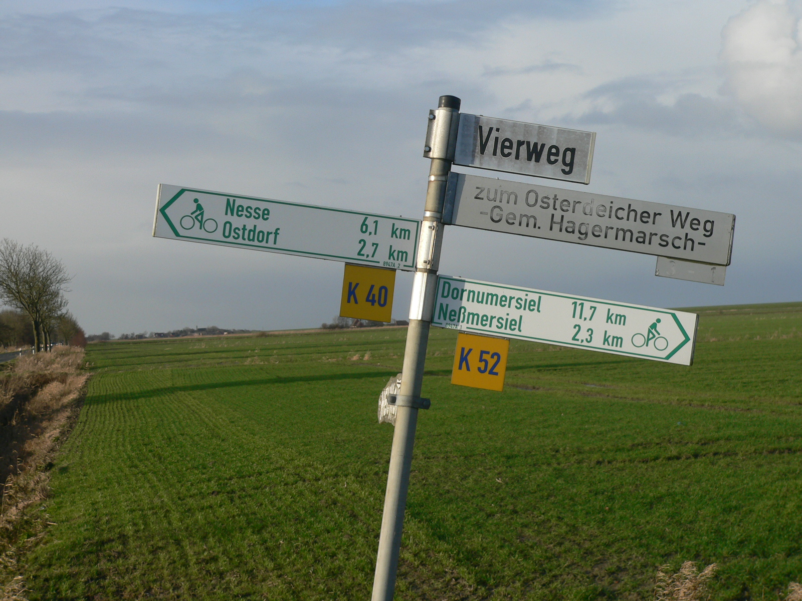 Es gibt übrigens nicht nur zwei Osterdeicher Wege, sondern auch zwei Vierwege, die zur Verwirrung Anlaß bieten. Warum die beide so heißen, wissen wir nicht. Google Maps neigt da zu einer falschen Anzeige (und Ihr GPS-Empfänger vielleicht auch), indem es als Zufahrt zum Deichblick den westlichen Vierweg empfiehlt, der bei Theener von der Küstenstraße aus, der L 5, direkt zu »unserem« Osterdeicher Weg (also dem Hilgenriedersieler) führt; aber da kommen Sie mit dem Auto nicht durch, wegen des erwähnten Trampelpfades. Nehmen Sie knappe zwei Kilometer weiter östlich, kurz vor oder hinter Neßmersiel (je nachdem, woher Sie kommen), den anderen Vierweg, auf dem Sie alsbald die bereits erwähnte Westerdeicher Straße erreichen. Da biegen Sie links ab, und dann wissen Sie ja jetzt, wie es weiter geht.